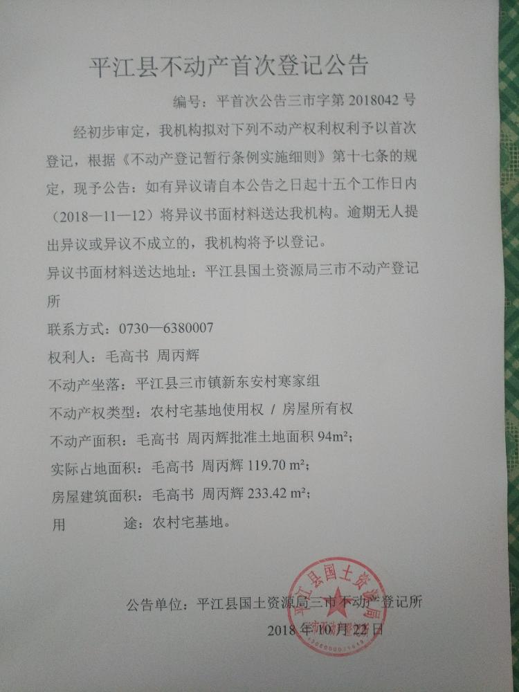 毛高书 周丙辉不动产首次登记公告 三市字第2018041号