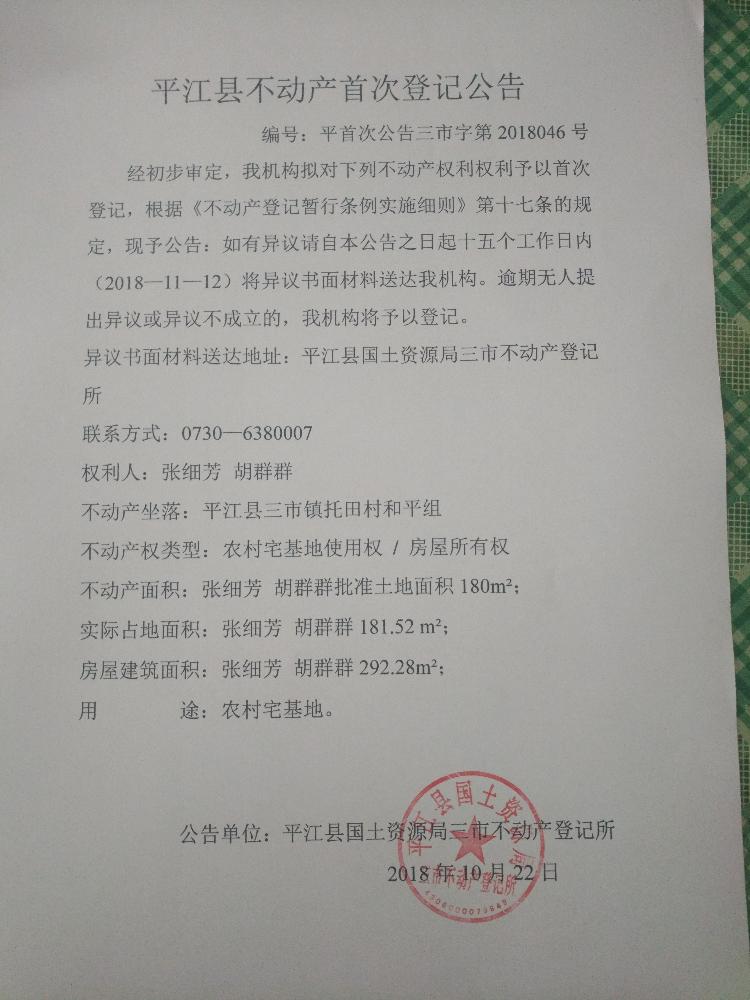 张细芳 胡群群不动产首次登记公告 三市字第2018046号