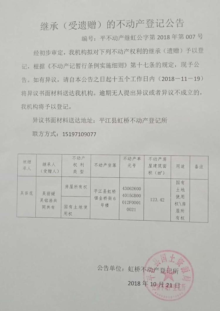 吴丽媛 吴铭浩继承(受遗赠)的不动产登记公告平不动产继虹公字第2018年第007号