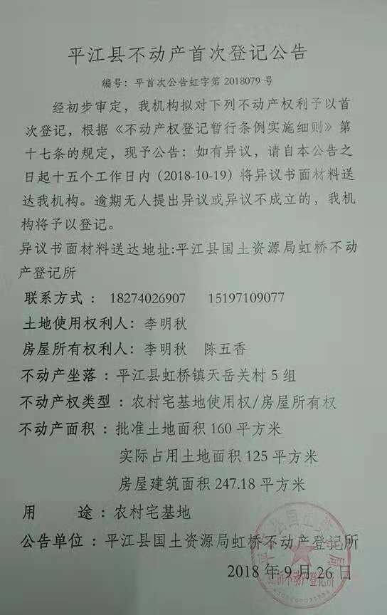 李明秋 陈五香不动产首次登记公告 虹字第2018079号