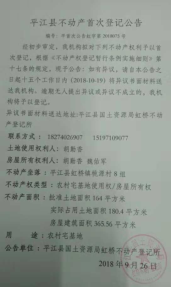 胡勤香 魏佑军不动产首次登记公告 虹字第2018075号