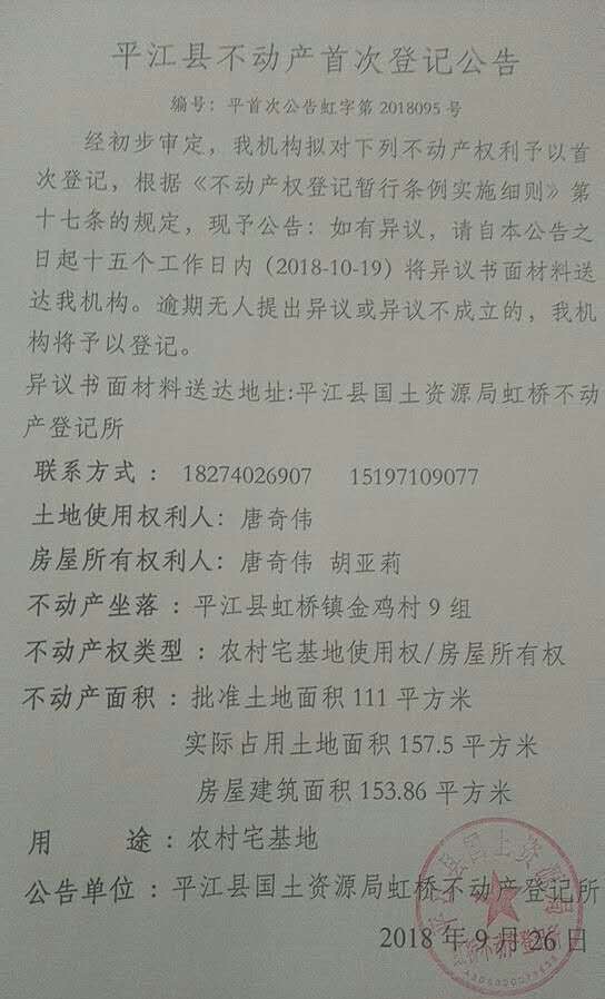 唐奇伟 胡亚莉不动产首次登记公告 虹字第2018095号