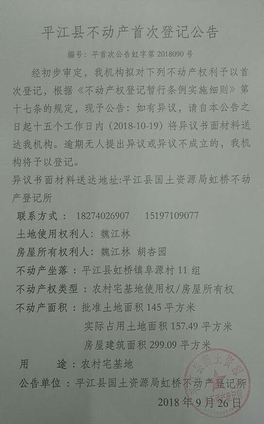 魏江林 胡杏园不动产首次登记公告 虹字第2018090号