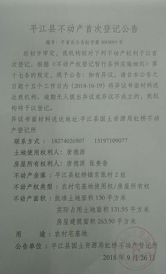 唐德源 张赉香不动产首次登记公告 虹字第2018093号