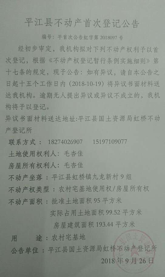 毛杏佳不动产首次登记公告 虹字第2018097号