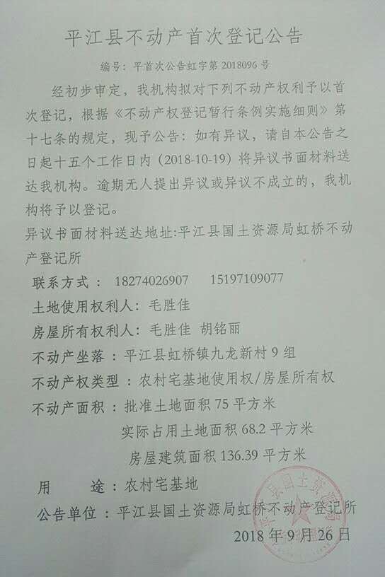 毛胜佳 胡铭丽不动产首次登记公告 虹字第2018096号