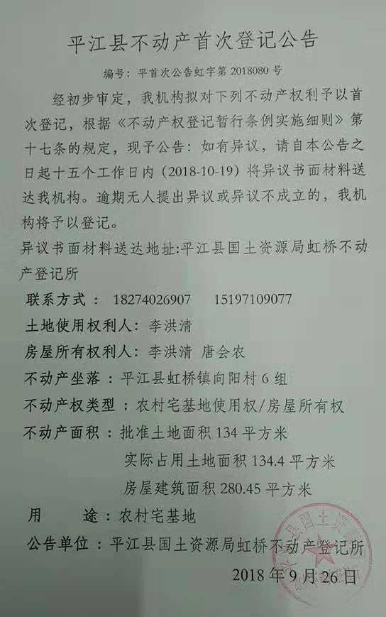 李洪清 唐会农不动产首次登记公告 虹字第2018080号