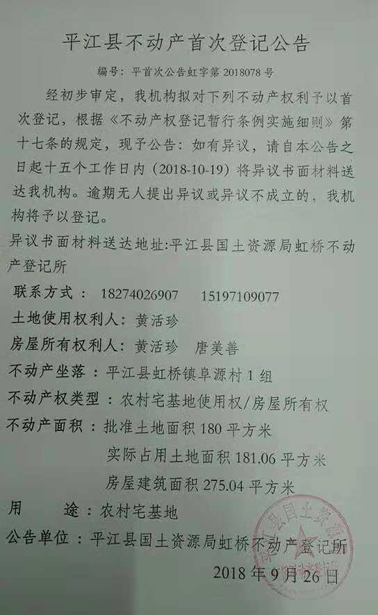 黄活珍 唐美善不动产首次登记公告 虹字第2018078号