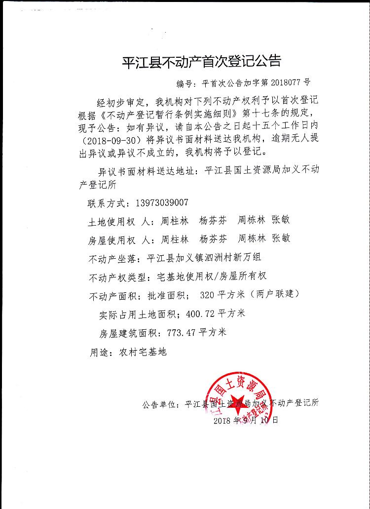 周柱林 杨芬芬 周栋林 张敏不动产首次登记公告 加字第2018077号