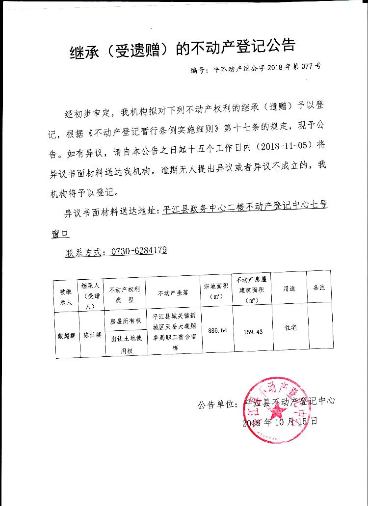 陈亚娜继承(受遗赠)的不动产登记公告平不动产继公字2018年第077号
