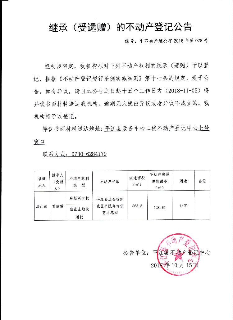 艾丽霞继承(受遗赠)的不动产登记公告平不动产继公字2018年第078号