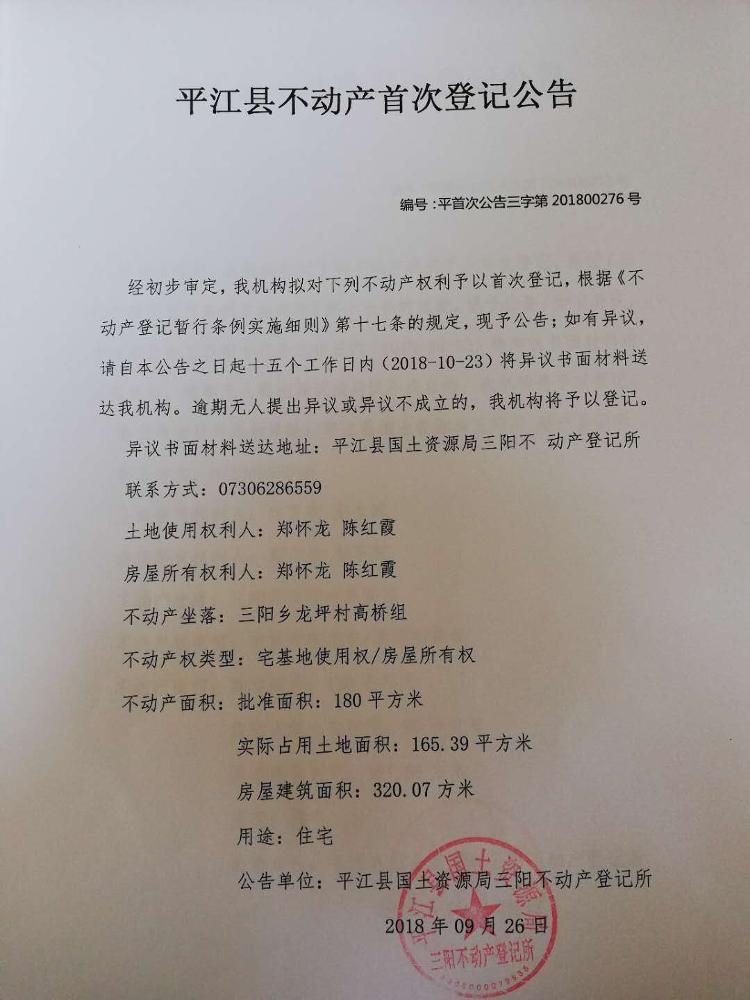 平江县三阳乡龙坪村 郑怀龙 陈红霞 不动产首次登记公告
