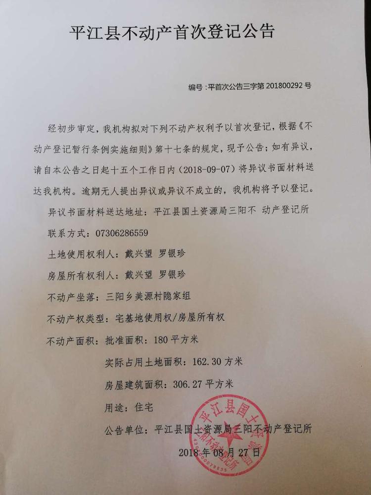 平江县三阳乡美源村 戴兴望 罗银珍 不动产首次登记公告
