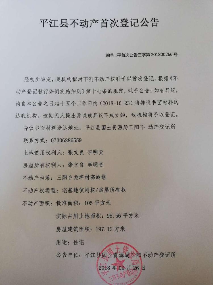 平江县三阳乡龙坪村 张文良 李明贵 不动产首次登记公告