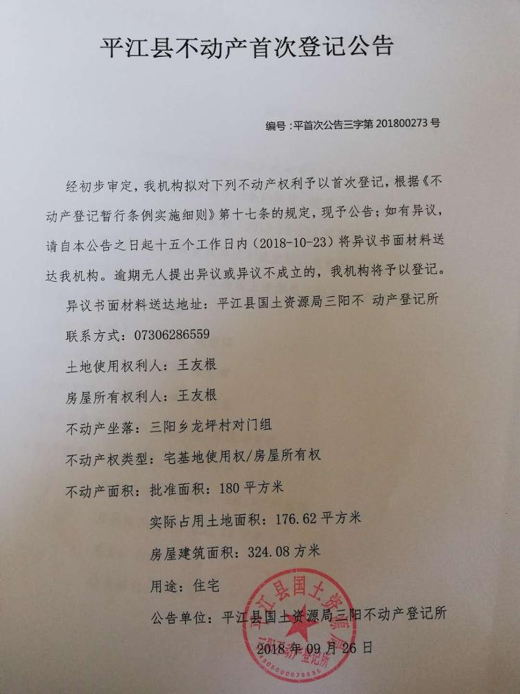 平江县三阳乡龙坪村 王友根 不动产首次登记公告