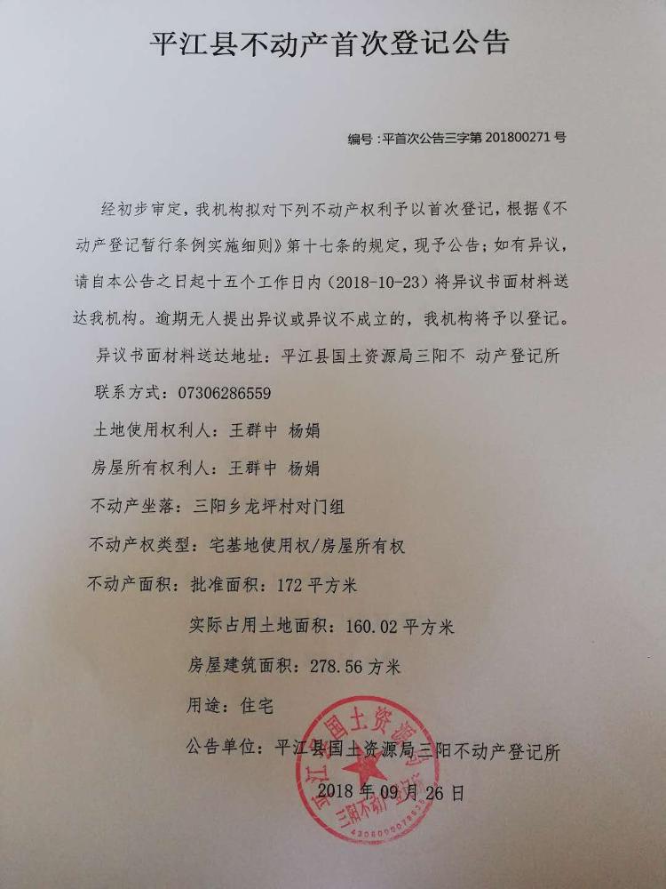 平江县三阳乡龙坪村 王群中 杨娟 不动产首次登记公告