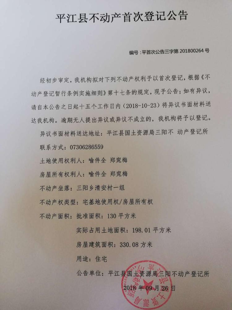 平江县三阳乡清安村 喻件全 郑窕梅 不动产首次登记公告