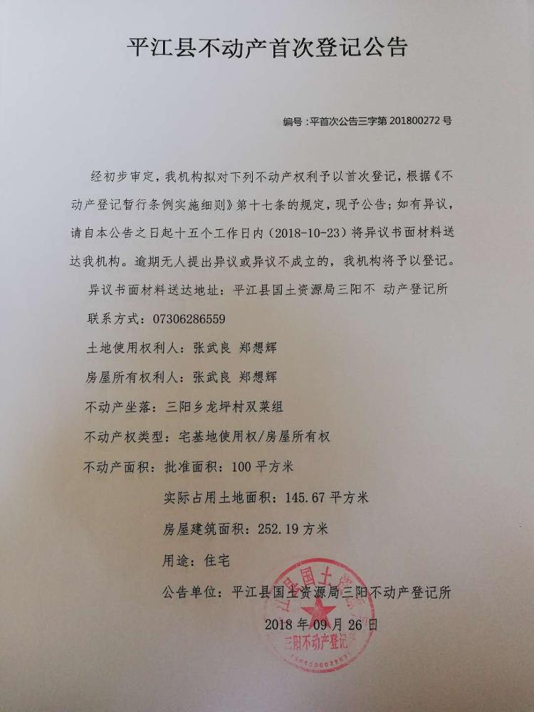 平江县三阳乡清安村 张武良 郑想辉 不动产首次登记公告