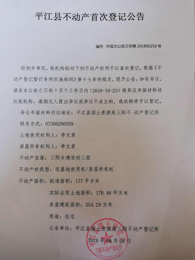 平江县三阳乡清安村 李文君 不动产首次登记公告