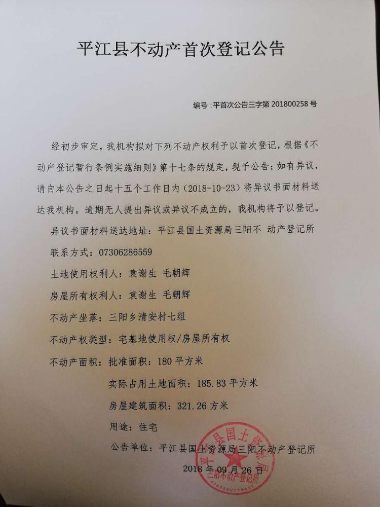 平江县三阳乡清安村 袁谢生 毛朝辉 不动产首次登记公告