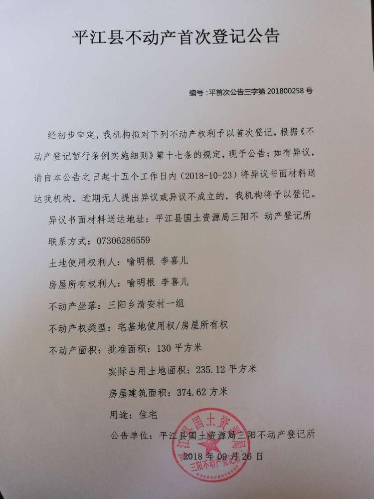 平江县三阳乡清安村 喻明根 李喜儿 不动产首次登记公告