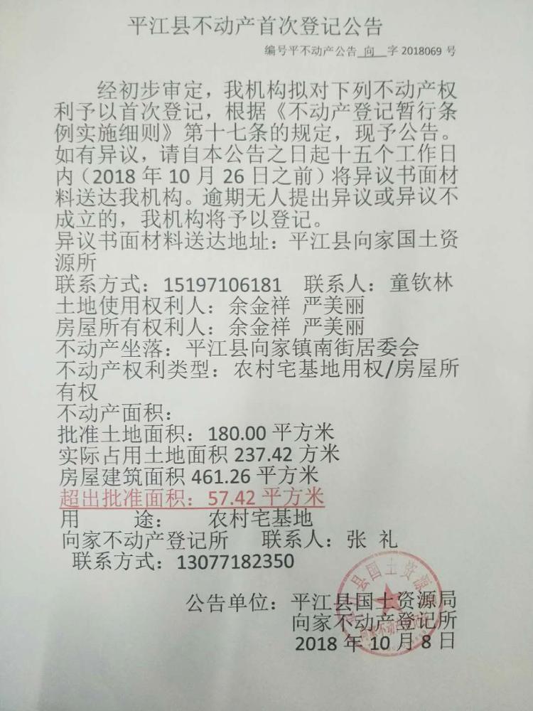 余金祥 严美丽不动产首次登记公告 向字2018069号