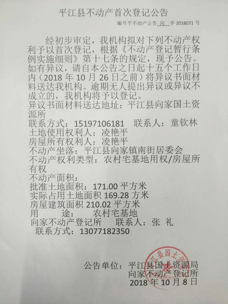 凌艳平不动产首次登记公告 向字2018071号