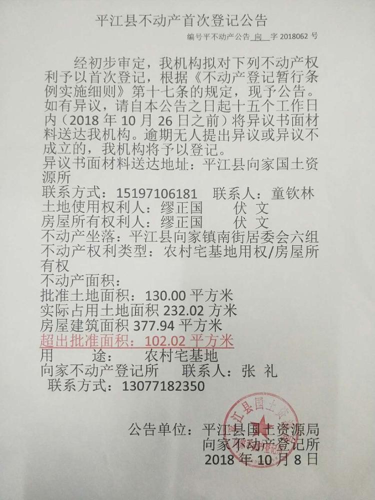 缪正国 伏文不动产首次登记公告 向字2018062号