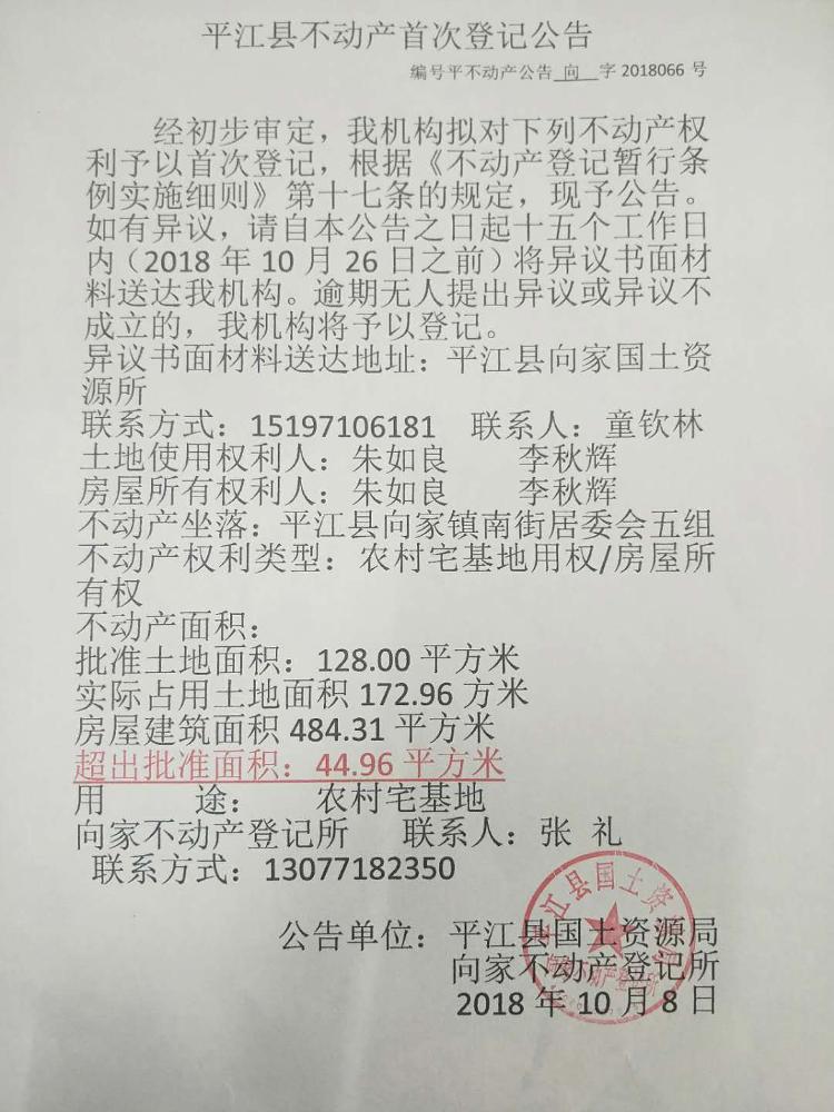 朱如良 李秋辉不动产首次登记公告 向字2018066号