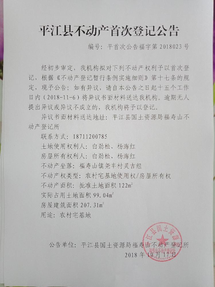 白劲松 杨海红不动产首次登记公告 福字第2018023号