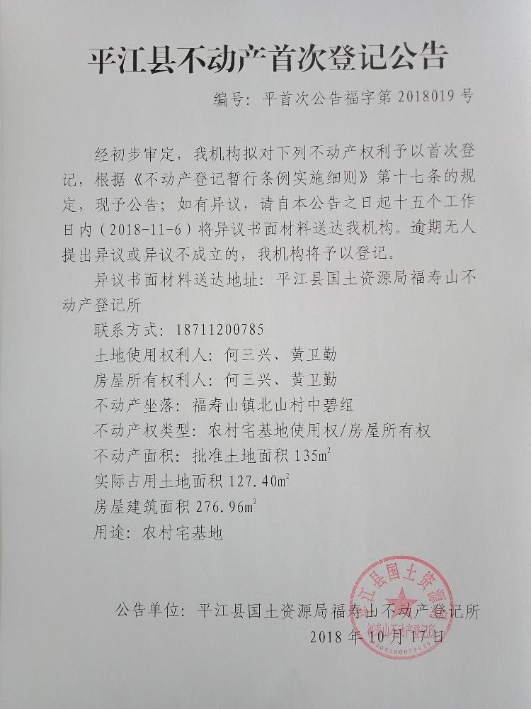 何三兴 黄卫勤不动产首次登记公告 福字第2018019号