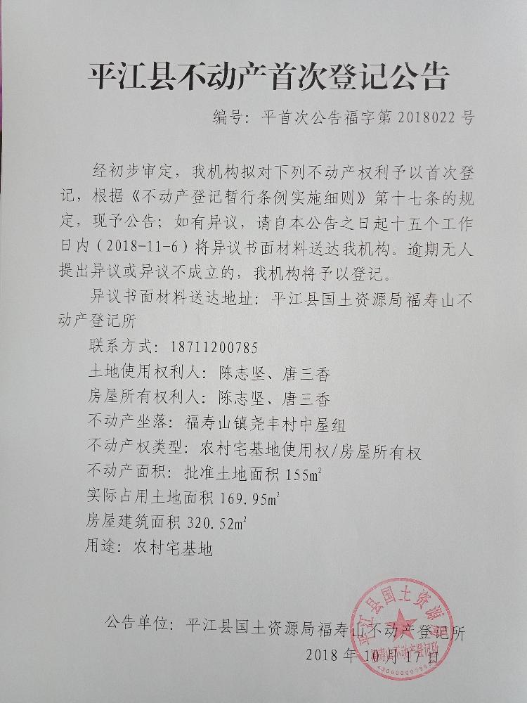 陈志坚 唐三香不动产首次登记公告 福字第2018022号