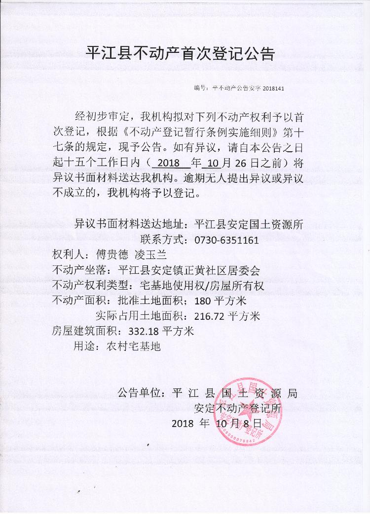 傅贵德 凌玉兰不动产首次登记公告 安字2018141