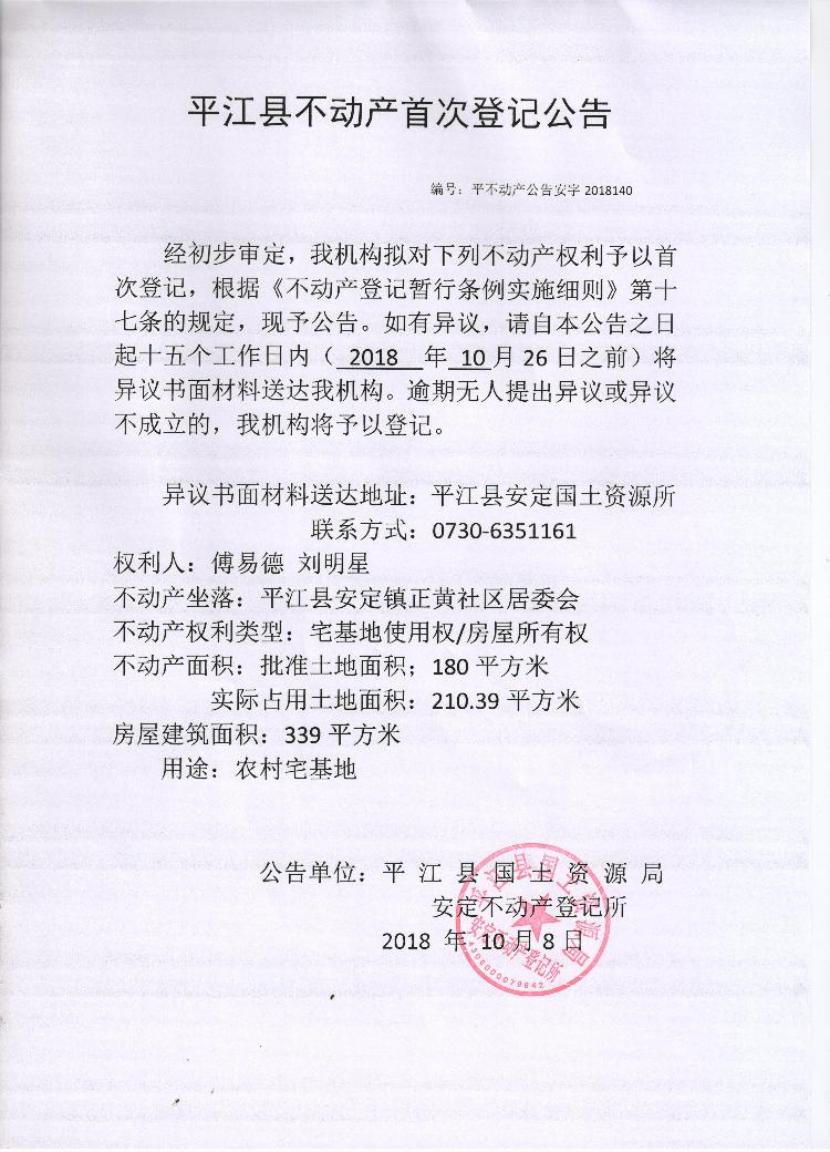 傅易德 刘明星不动产首次登记公告 安字2018140
