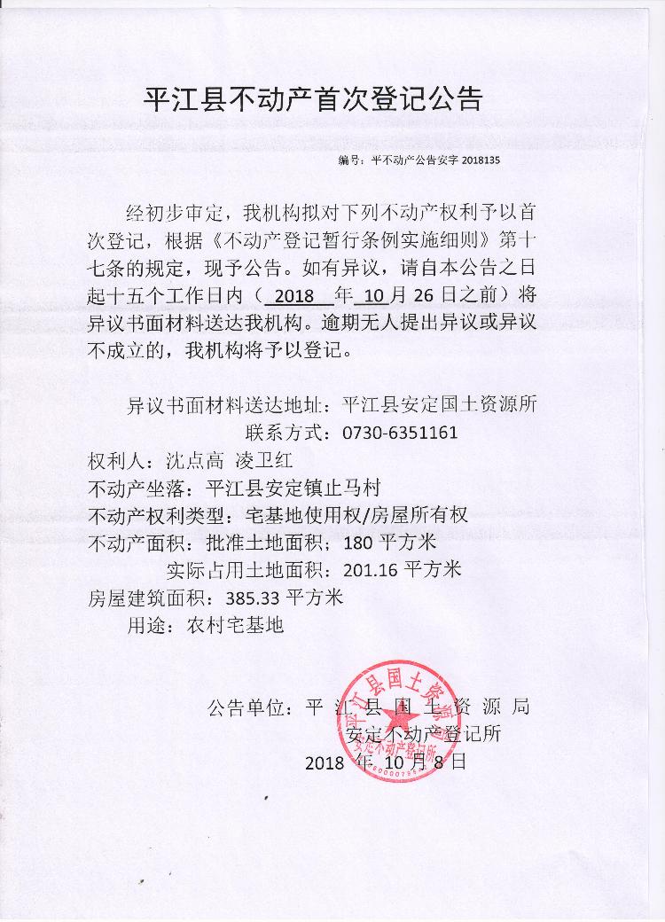 沈点高 凌卫红不动产首次登记公告 安字2018135