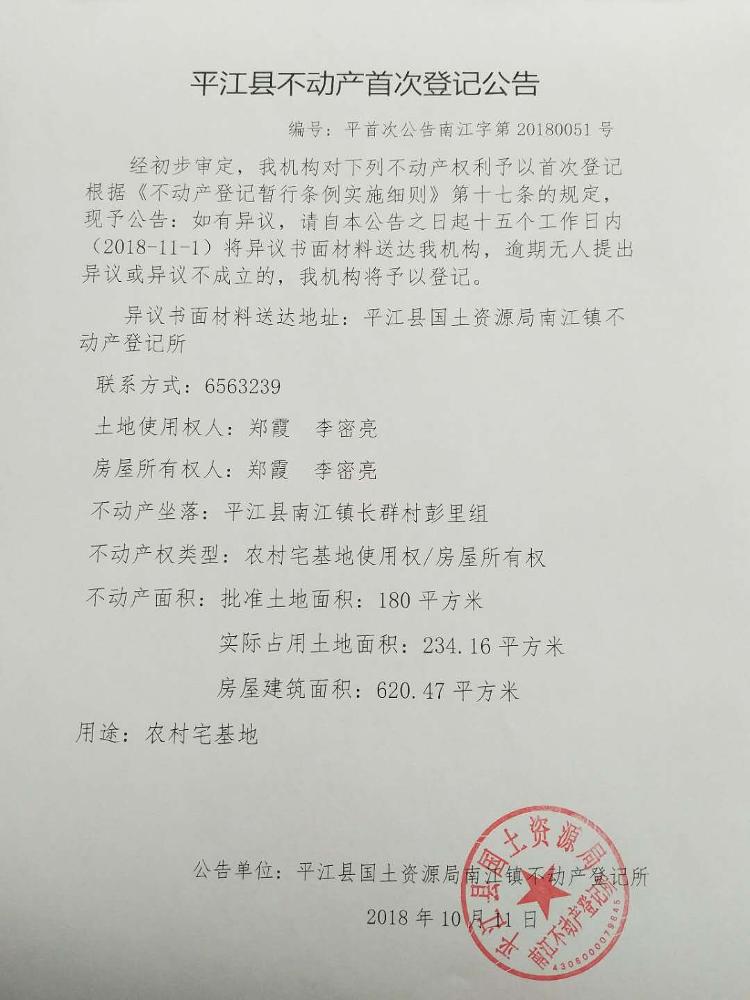 郑霞 李密亮不动产首次登记公告平首次公告南江字第20180051号