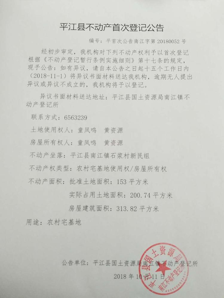 童凤鸣 黄资源不动产首次登记公告平首次公告南江字第20180052号