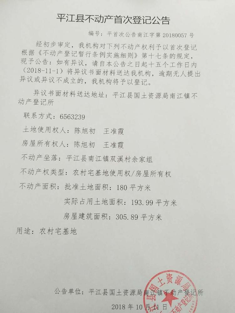 陈旭初 王准霞不动产首次登记公告平首次公告南江字第20180057号