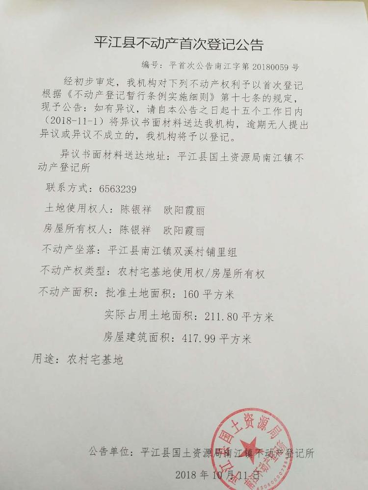 陈银祥 欧阳霞丽不动产首次登记公告平首次公告南江字第20180059号