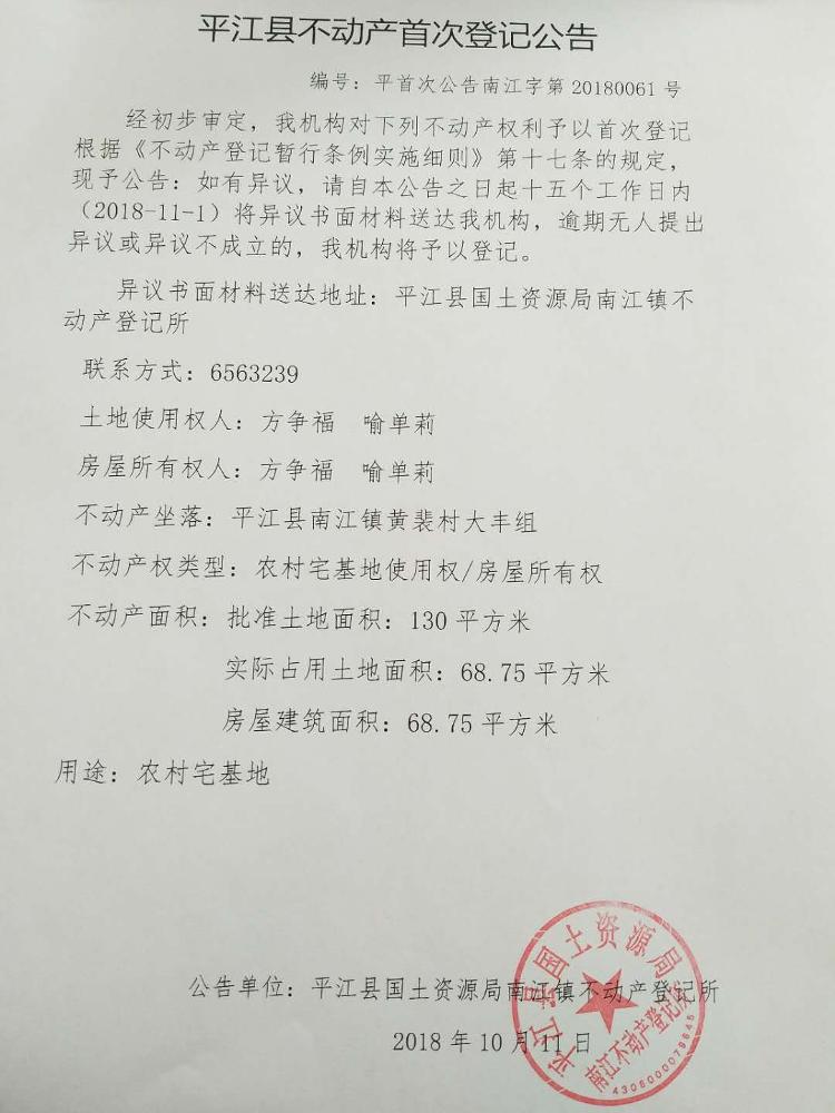 方争福 喻单莉不动产首次登记公告平首次公告南江字第20180061号