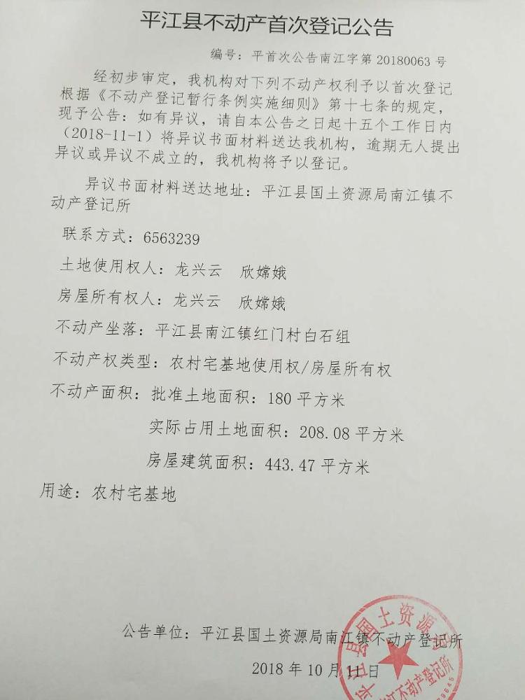 龙兴云 欣嫦娥不动产首次登记公告平首次公告南江字第20180063号