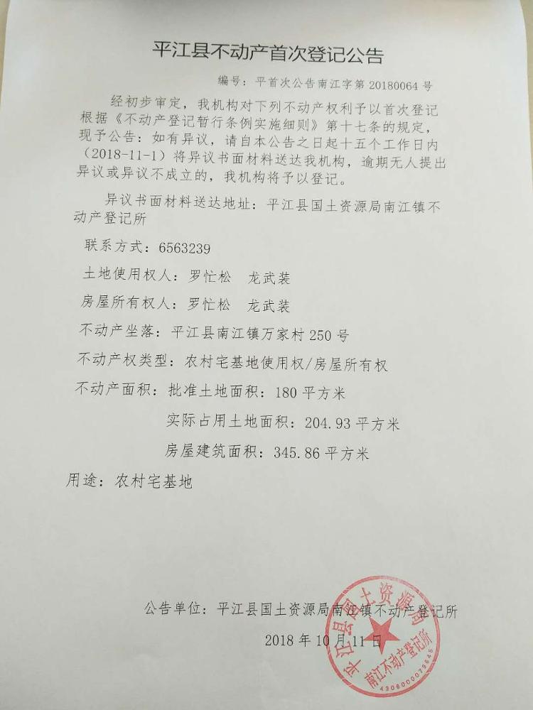 罗忙松 龙武装不动产首次登记公告平首次公告南江字第20180064号