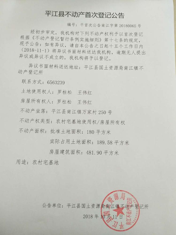 罗柱松 王伟红不动产首次登记公告平首次公告南江字第20180065号