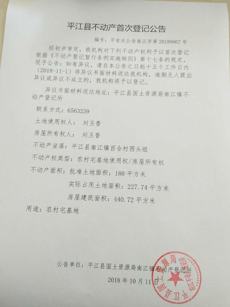 刘玉香不动产首次登记公告平首次公告南江字第20180067号