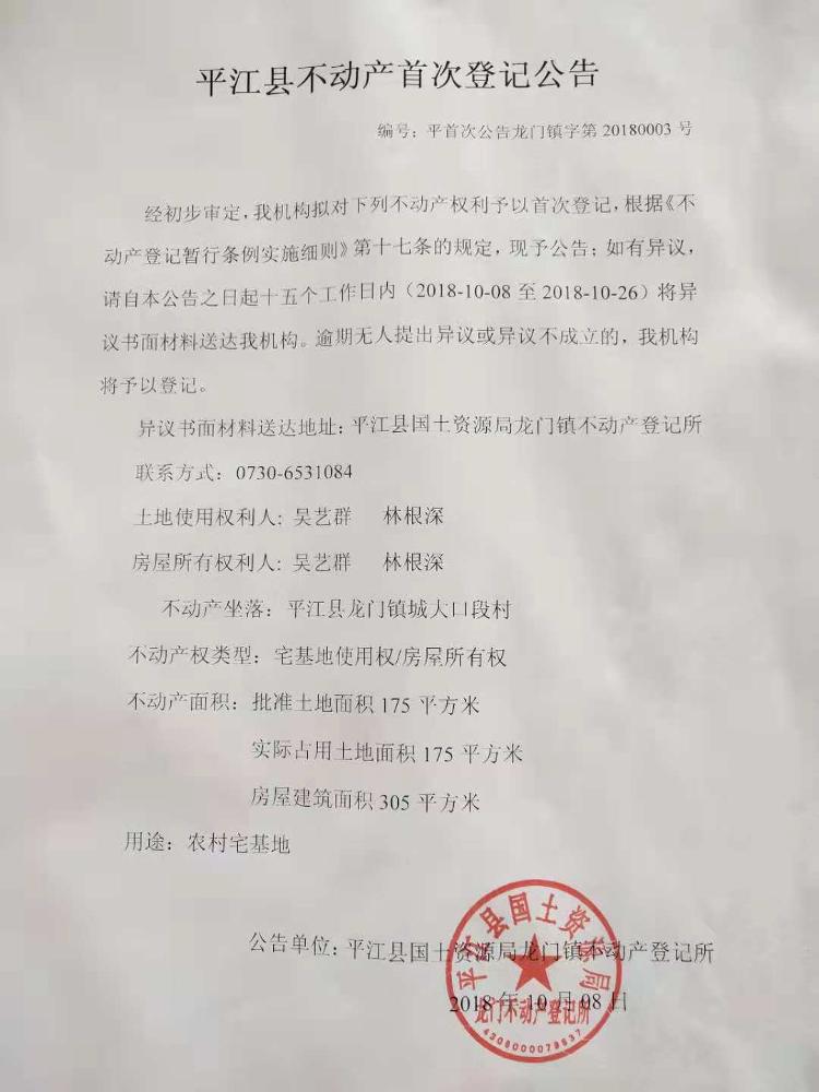 吴艺群 林根深不动产首次登记公告平首次公告龙门镇字第20180003号
