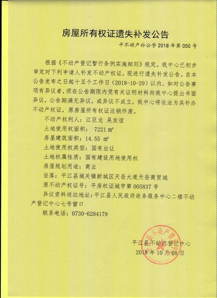 江巨龙 吴友谊房屋所有权证遗失补发公告平不动产补公字2018年第050号
