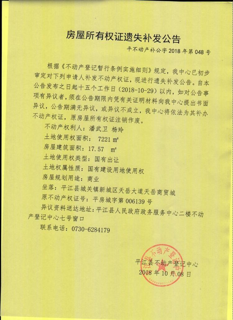 潘武卫 杨玲房屋所有权证遗失补发公告平不动产补公字2018年第048号