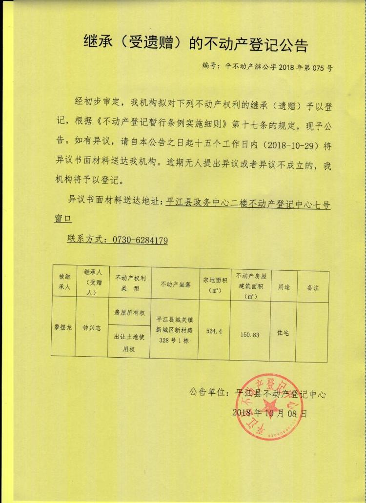钟兴志继承(受遗赠)的不动产登记公告平不动产继公字2018年第075号