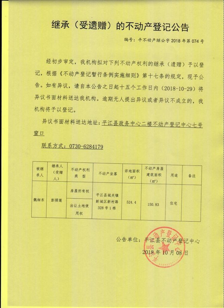 彭照莲继承(受遗赠)的不动产登记公告平不动产继公字2018年第074号