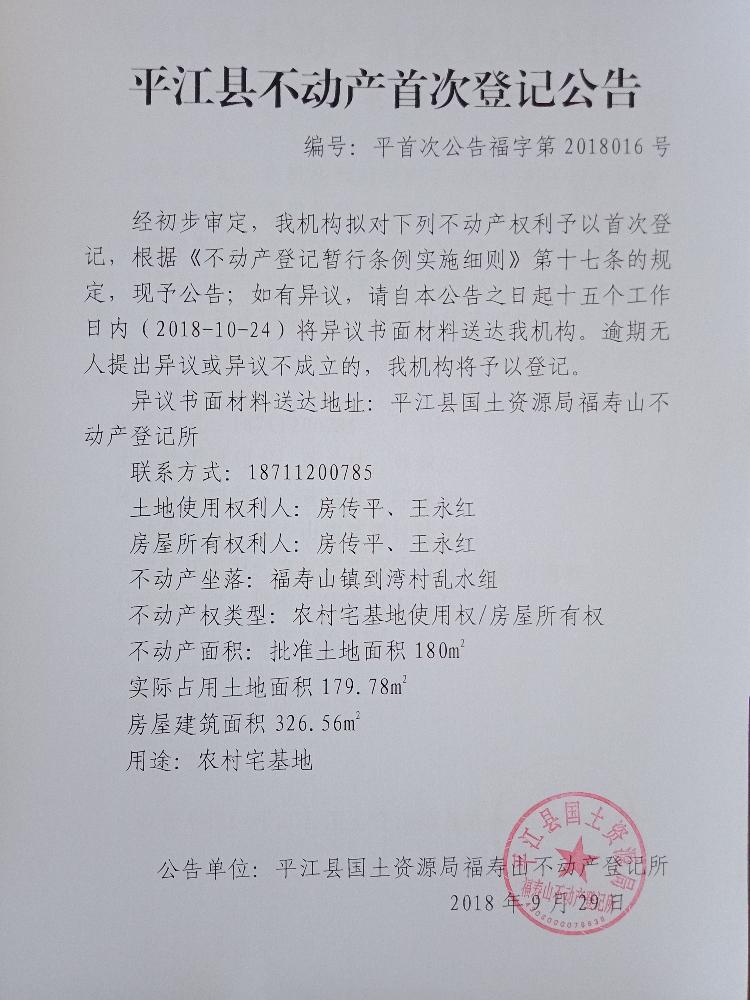 房传平 王永红不动产首次登记公告 福字第2018016号
